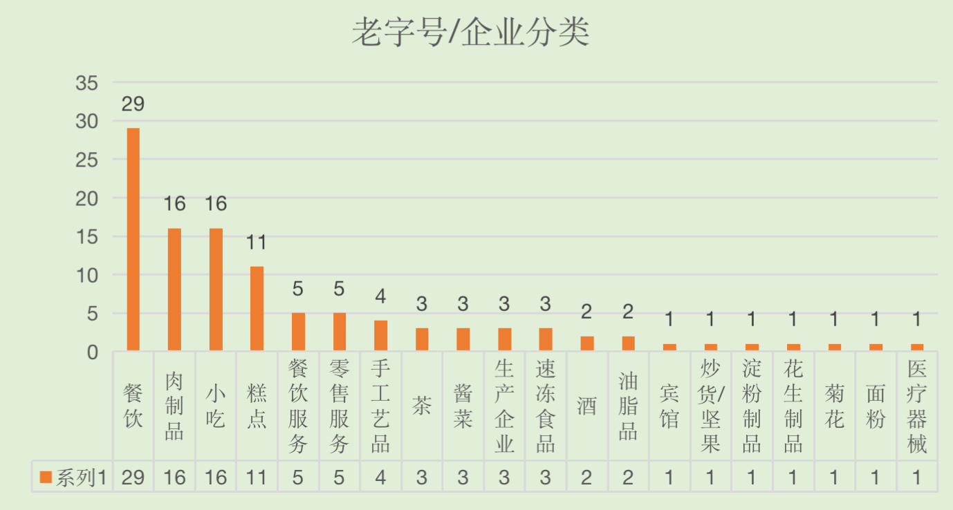 經(jīng)了解,老字號均在市商務局進行了備案,其中:中華老字號3家,河南老字號26家,開封老字號99家,合計128家。鑒于個別老字號同時持有中華老字號、開封老字號或河南老字號、開封老字號,經(jīng)過重合部分篩選合并,開封行政區(qū)域內(nèi)老字號共有109家(具體見附件)。經(jīng)對老字號初步類別劃分,共5大類(空間類、小吃類、服務類、飲品類、手工藝類),20小類,具體如下: